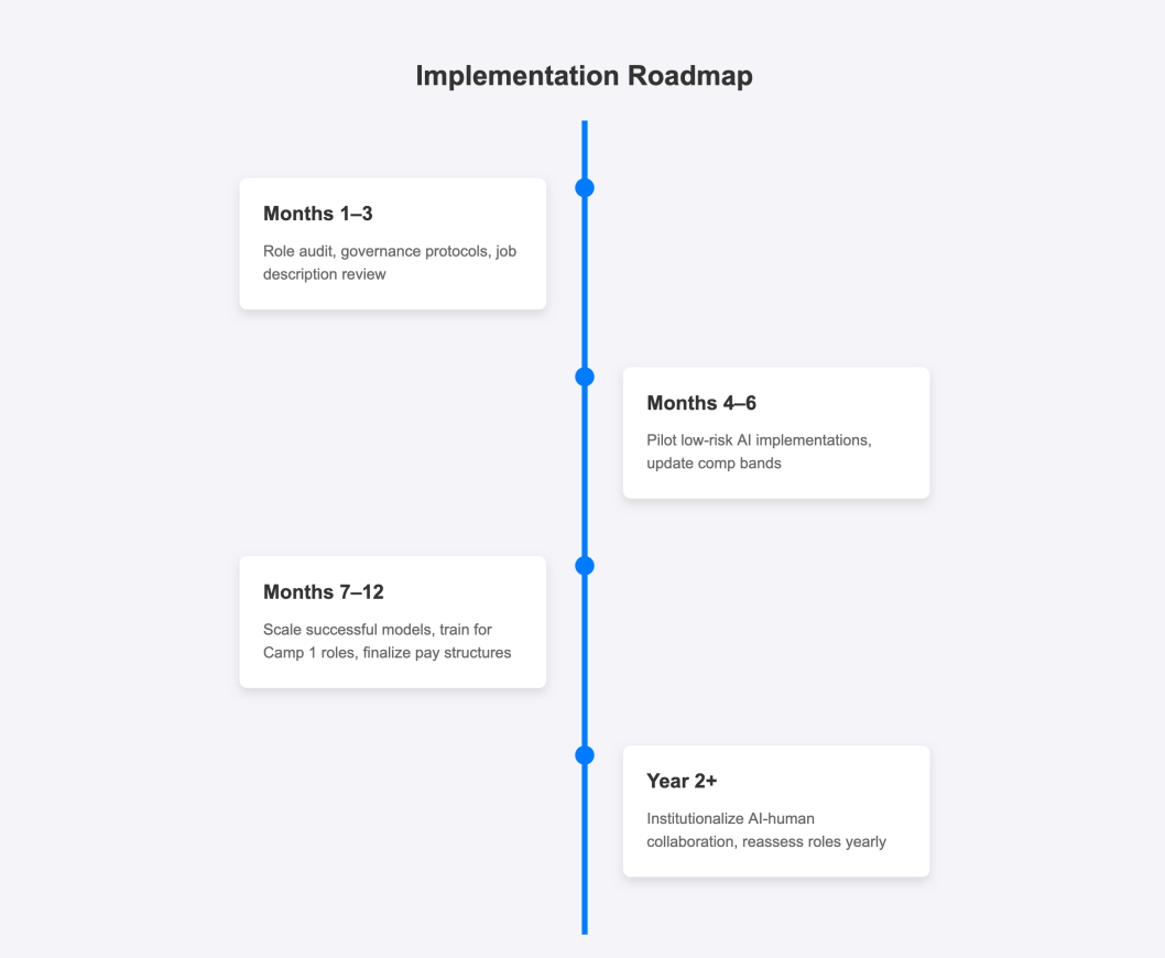 Year 2+: Institutionalize AI-human collaboration, reassess roles yearly