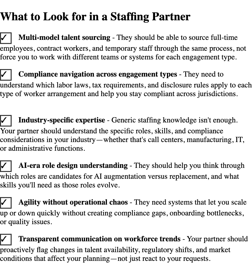 Managing workforce complexity at this scale requires infrastructure; most companies don't have in-house. Here's what your staffing partner should bring to the table: